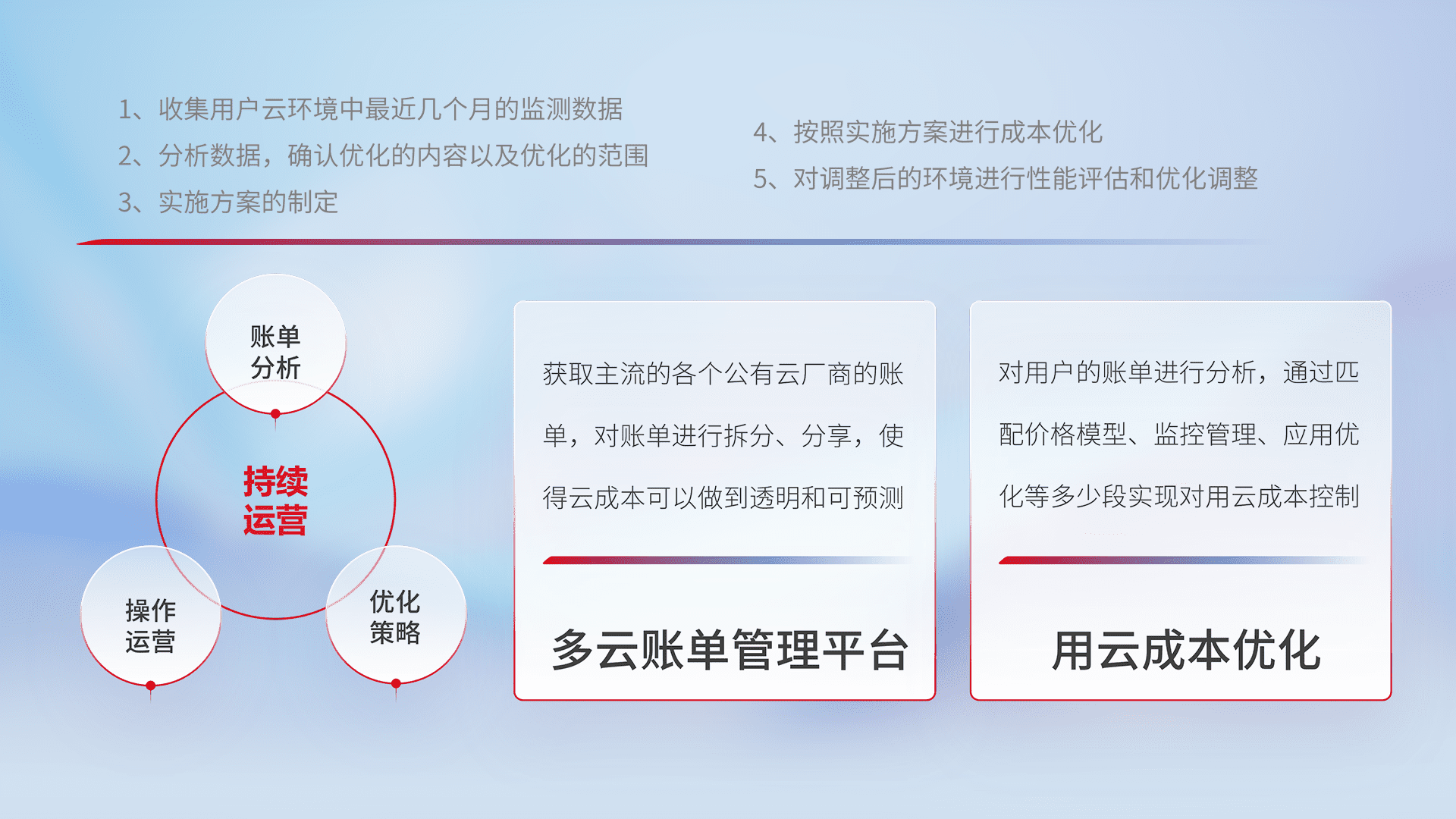 通过多云纳管,,,以统一的资源数据模型把客户的云资源进行抽象和封装,,进而实现对多云资源的统一操作,,,,保障云资源管理的可靠性、、稳定性与可用性。。。量身定制化运维内容,,,配置、、、、开发运维、、、补丁管理、、备份、、、、监控、、、认证和访问管理、、、、审计和日常巡检等,,,保障在用云过程中的可靠度,,,稳定度以及高可用率。。。。